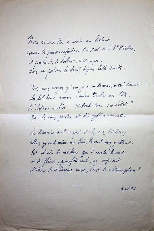 Guy-Charles Cros (1879-1956), poète. Poème autographe, avril 1946, 1p in-folio. Poème de 13 vers, commençant par « Nous sommes tous à croire au bonheur / Comme de pauvres enfants au Père Noël ou à St Nicolas ». Nous ne savons pas s'il a été publié. Cachet de la collection Jean-Louis Debauve. [412]