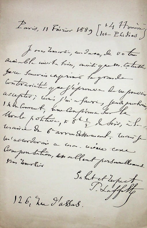 Pierre Laffitte (1823-1903), philosophe, positiviste, successeur d'Auguste Comte, professeur au Collège de France. L.A.S., Paris, 11 février 1889 [14 Homère 101], 1p in-8. A la compositrice Augusta Holmès (1847-1903), compagne de Catulle Mendès (1841-1909) : « Je vous remercie, madame, de votre aimable invitation, ainsi que M. Catulle. Je ne saurais exprimer la grande contrariété que j'éprouve de ne pouvoir accepter ; mais j'ai à faire jeudi prochain, 14 du courant, une conférence sur la Morale positive, à 8h1/2 du soir, à la mairie du 6e arrondissement. Mais je m'accorderais à moi-même une compensation en allant personnellement vous remercier. Salut et respect. P. Laffitte ». Rare. [413]