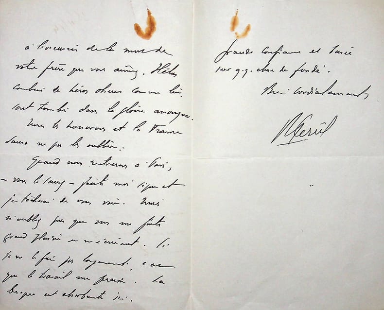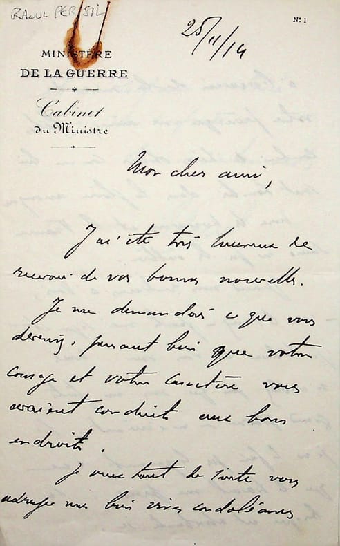 Raoul Persil (1870-1961), homme politique, député du Loir-et-Cher, proche d'Alexandre Millerand. L.A.S., 25 novembre 1914, 2p 1/2 in-8. En tant que Ministre. A Jacques Mortane (1883-1939), journaliste, spécialiste de l'aviation. Lettre amicale et de condoléances pour la mort de son frère. [413]
