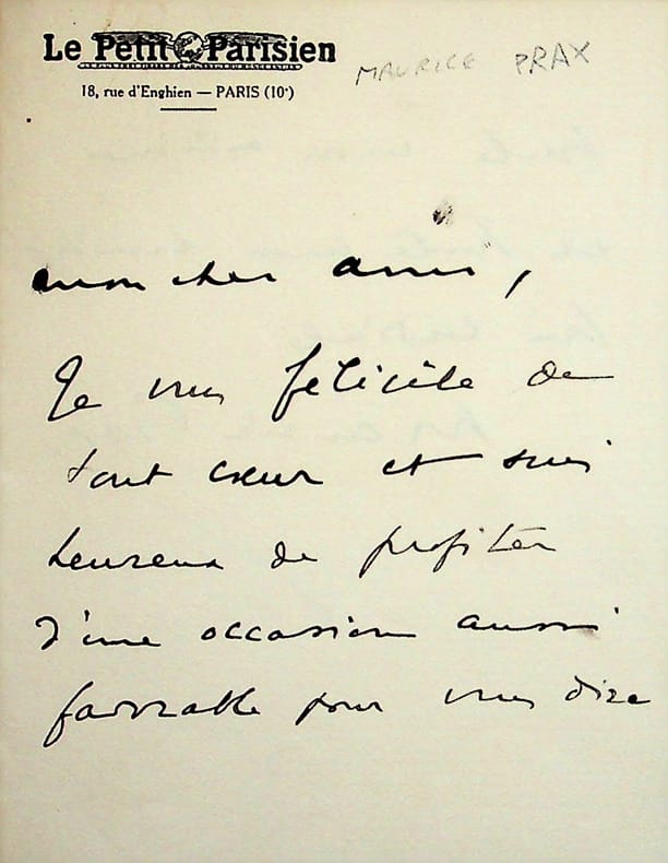 Maurice Prax (1881-1962), écrivain, journaliste. L.A.S., sd, 1p 1/2 in-12. A Jacques Mortane (1883-1939), journaliste, spécialiste de l'aviation. Lettre de remerciements. [413]