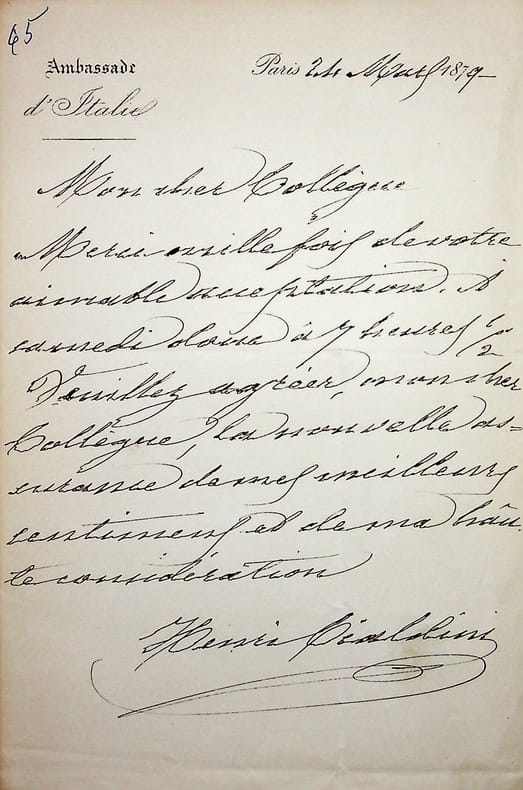 Enrico Cialdini (1811-1892), général, homme politique, ambassadeur d'Italie en France. L.A.S., Paris, 24 mars 1879, 1p in-8. Il remercie son correspondant d'avoir accepté son invitation. [413]