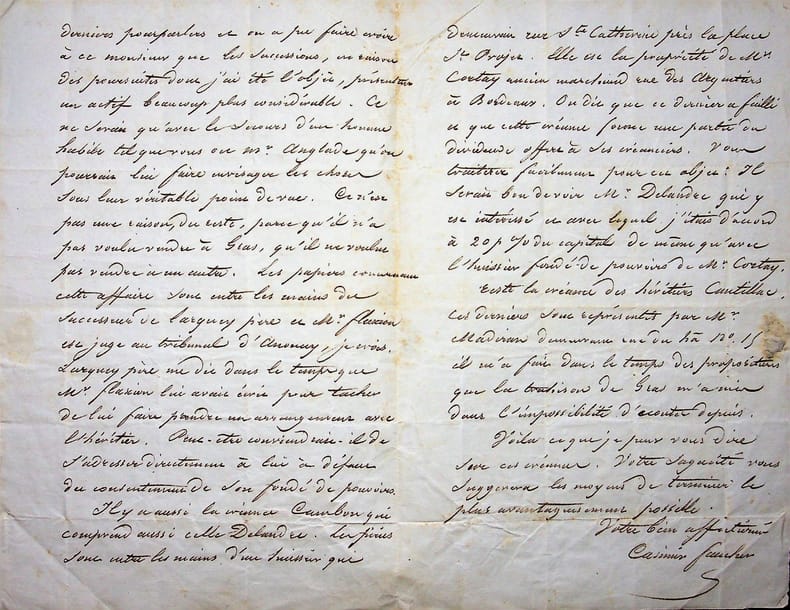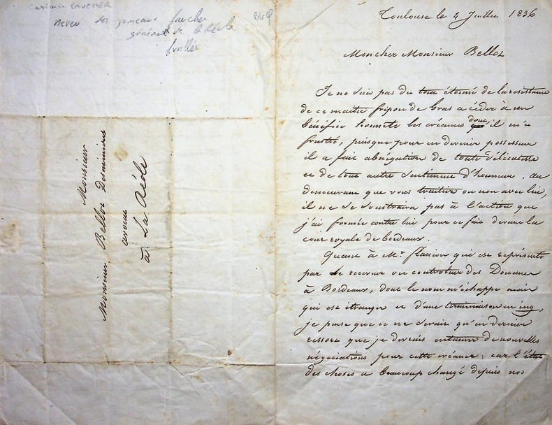 Casimir Faucher (XIXe), écrivain, neveu des frères Faucher, de la Réole. L.A.S., Toulouse, 4 juillet 1836, 3p in-8. A Pierre Henri Bellot des Minières (1787-1863), avocat, maire de La Réole. A propos d'une histoire financière. [413]