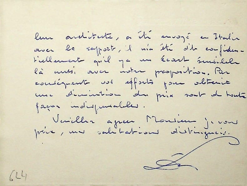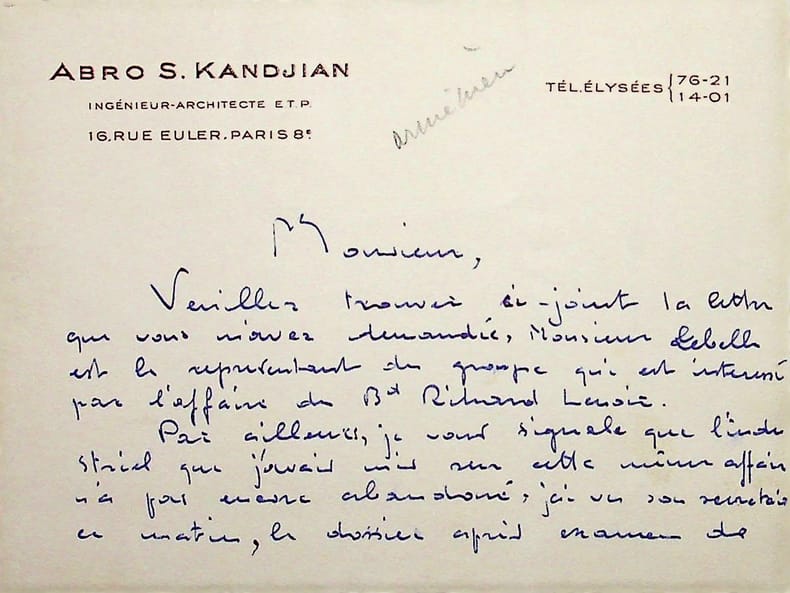 Abro S. Kandjian (1906-1997), architecte d'origine arménienne. L.A.S., sd, 2p in-12. A propos d'une « affaire » boulevard Richard Lenoir, a priori un projet d'immeuble. [413]