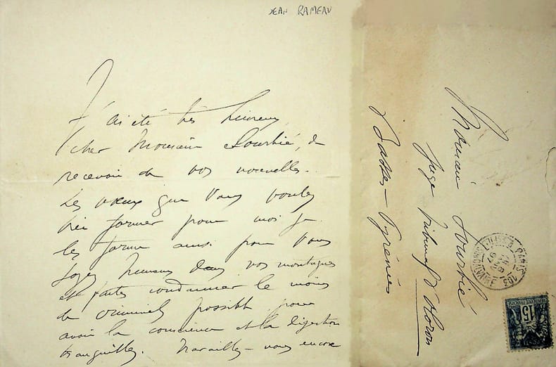 Jean Rameau (1858-1942), poète, romancier, membre des Hydropathes. L.A.S. + enveloppe, 8 janvier 1897, 2p 1/2 in-8. A M. Sourbié, alors juge à Oloron. Belle lettre de voeux. [413]