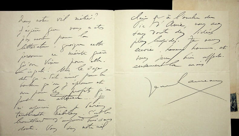 [ 3 L.A.S. adressées à Mlle Simone Arnaud Delage ] Lettre autographe signée de Camille Doucet, de l'Académie Française, 1 page à en-tête de l'Institut de France sous enveloppe marquée "Académie Française", datée du 25 mai 1885 : "Mademoiselle et chère confrère, Rien de plus touchant et de plus dramatique que votre Roche "Mengan", j'en suis encore tout ému & je m'empresse de joindre mes très sincères compliments aux remerciements que je vous dois pour votre bon et gracieux souvenir" ; Lettre autographe signée de Georges Monval, Bibliothécaire Archiviste de la Comédie Française, datée du 12 février 1883, 1 page sous enveloppe : "Mademoiselle, J'ai l'honneur de vous informer que, dans sa séance du 8 février, le Comité d'Administration du Théâtre Français a pris connaissance du rapport fait par la Commission d'examen sur votre comédie : "Mademoiselle du Vigean". J'ai en même temps le plaisir de vous annoncer que le Comité, s'associant aux conclusions de ce rapport, a réservé votre ouvrage pour l'envoyer devant le Comité de Lecture" ; Lettre autographe signée d'Albert Delpit, 4 pages sous enveloppe : "Mademoiselle, j'irai vous voir demain. [ ... ] Il est fort possible que je ne sois pas libre à 4 h ; mais plus tard. Et j'ai besoin de vous voir car j'ai des conseils importants à vous donner sur Jane Grey. Voulez-vous que nous admettions ceci ? Si vous ne receviez rien de moi, demain avant midi, c'est que j'irai rue St Pétersbourg [ ... ]