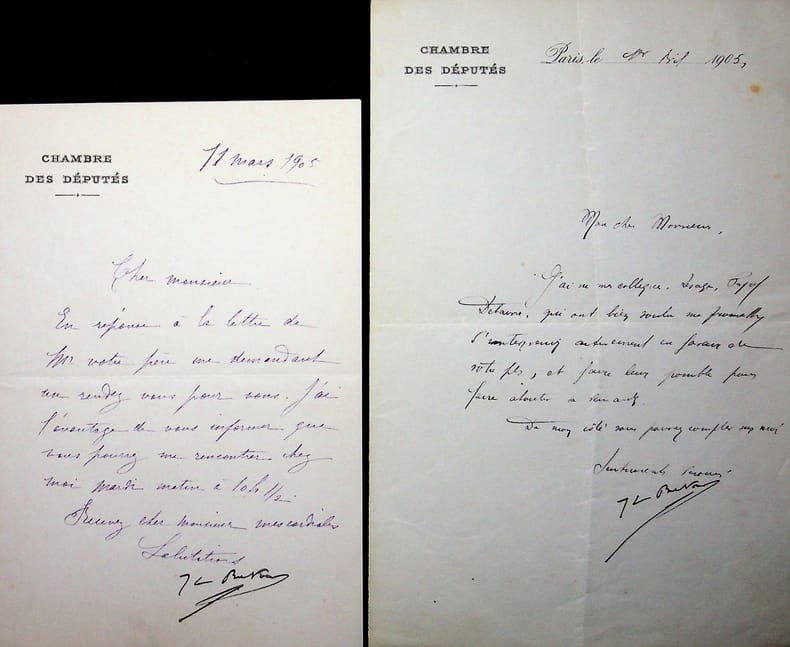Lot de 2 L.S., 3 août 1925 et 17 août 1926. En-tête de la chambre des députés. Deux lettres auxquelles était joint un chèque. Les lettres sont adressées à M Beraud, négociant rue Réaumur à Paris.