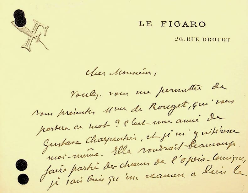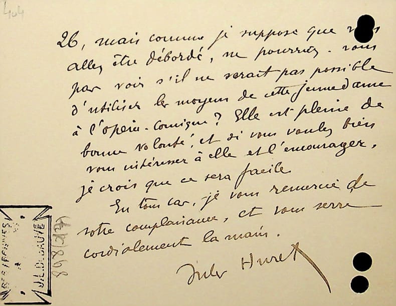 Jules Huret (1863-1915), écrivain, journaliste. L.A.S., sd, 2p in-12. Au mime Georges Wague (1874-1965). Il lui introduit madame de Rouget, amie de Gustave Charpentier, qui souhaite faire partie des choeurs de l'Opéra-Comique. Cachet de la collection Jean-Louis Debauve. [413]