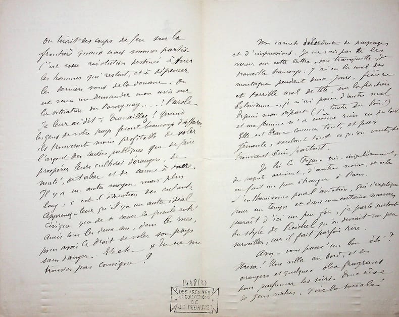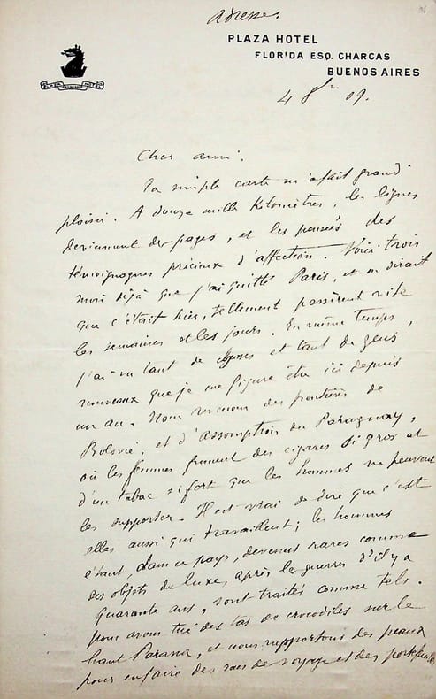 Jules Huret (1863-1915), écrivain, journaliste. L.A.S., Buenos Aires, 4 octobre 1909, 4p in-8. A l'écrivain André Braunier (1869-1925). Très belle lettre donnant des détails de son voyage, étant notamment allé aux frontières de la Bolivie et du Paraguay « où les femmes fument des cigares si gros et d'un tabac si fort que les hommes ne peuvent les supporter », etc. Belle lettre. Cachet de la collection Jean-Louis Debauve. [414]