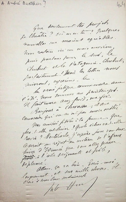 Jules Huret (1863-1915), écrivain, journaliste. L.A.S., Buenos Aires, 21 mars 1910, 4p in-8. A l'écrivain André Braunier (1869-1925). Longue lettre mentionnant son voyage en Argentine, les moyens de transport, des lieux visités, les problèmes rencontrés (« nous avons failli périr dans une tempête sur ce lac »), etc. Belle lettre. Cachet de la collection Jean-Louis Debauve. [414]