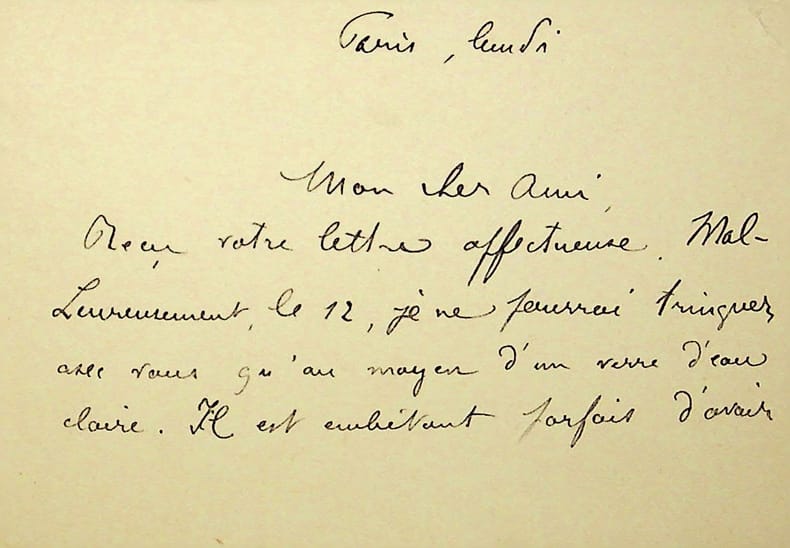 Léon Hennique (1850-1935), écrivain, président de l'Académie Goncourt. L.A.S., sd [lundi, 1917?], 2p in-12. A l'écrivain Jean Ajalbert (1863-1947), membre de l'Académie Goncourt. Il le remercie pour sa lettre, ne pourra trinquer qu'à l'eau à cause de sa sciatique et le remercie pour son livre Le Maroc sous les Boches, publié en 1917. [414]