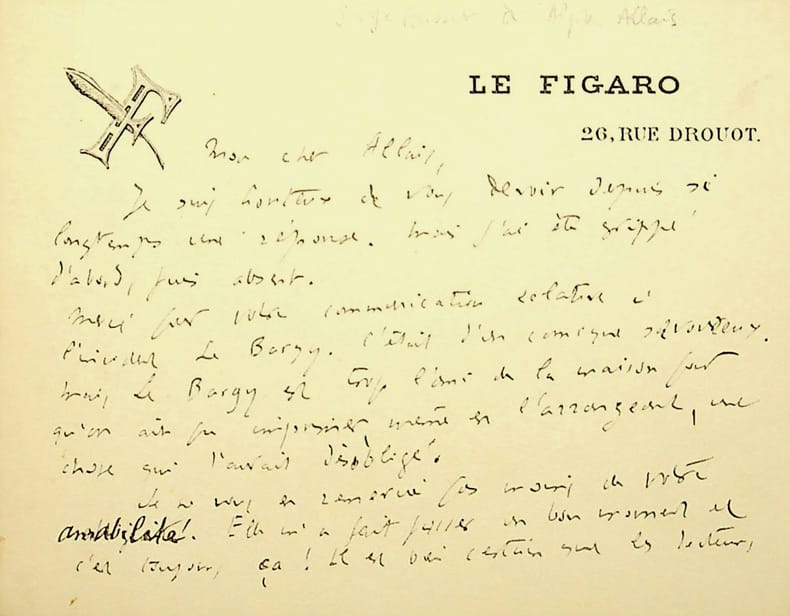 Serge Basset (1865-1917), écrivain, journaliste. L.A.S., sd, 1p 1/2 in-12. A l'écrivain Alphonse Allais (1854-1905). Joli courrier répondant tardivement à Allais, car il a été grippé, et parlant d'un « incident Le Bargy », faisant donc référence à l'acteur Charles Le Bargy (1858-1936). [414]