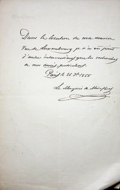Manuel Pando Fernández de Pineda, marquis de Miraflores (1792-1872), ministre espagnol, premier ministre, président du sénat. L.A.S., Paris, 26 septembre 1868, 1/2p in-8. « Dans la location de ma maison, rue de Luxembourg, je n'ai eu point d'autres intermédiaires que les recherches de mes amis, particuliers. Le marquis de Miraflores ». [414]