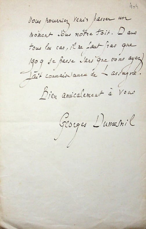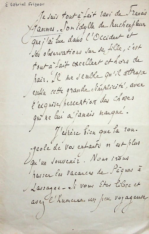 Georges Dumesnil (1855-1916), écrivain, professeur. L.A.S., sd, 1p 1/2 in-8. A Gabriel Frizeau (1870-1938), viticulteur, collectionneur. Lettre amicale mentionnant notamment le poète Francis Jammes. [414]