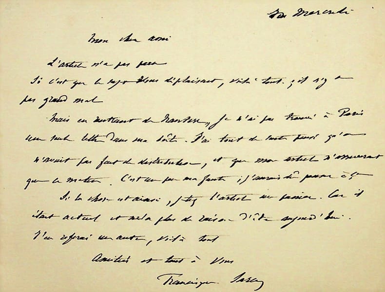 Francisque Sarcey (1827-1899), écrivain, journaliste. L.A.S., sd [mercredi], 1p in-12 oblong. Lettre à un ami à propos d'un article de Sarcey qui n'a pas paru. [414]