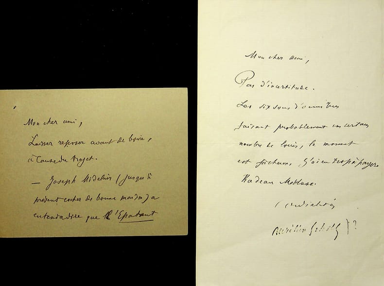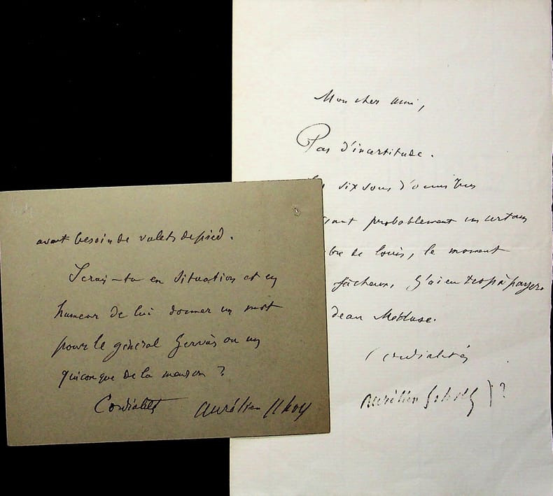 Aurélien Scholl (1833-1902), écrivain, journaliste. L.A.S., sd, 2p in-12. « Mon cher ami, laissez reposer avant de voir à cause du trajet - Joseph Midelain (jusqu'à présent cocher de bonne maison) a entendu dire que l'Epatant avait besoin d'un valet de pied. Serais-tu en situation et en humeur de lui donner un mot pour le général Gervais ou un quiconque de la maison ? Cordialement Aurélien Scholl ». On joint une seconde lettre curieuse. Elle est autographe mais la signature semble être un tampon. [414]