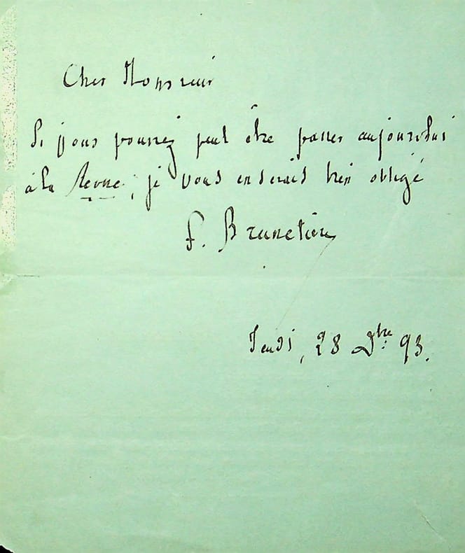 Ferdinand Brunetière (1849)1906), historien de la littérature, critique littéraire, membre de l'Académie française. L.A.S., 28 décembre 1893, 1p in-12. Court billet à M. Moreau : « cher Monsieur, Si vous pouviez peut-être passer aujourd'hui à la Revue, je vous en serais bien obligé. F Brunetière ». [414]