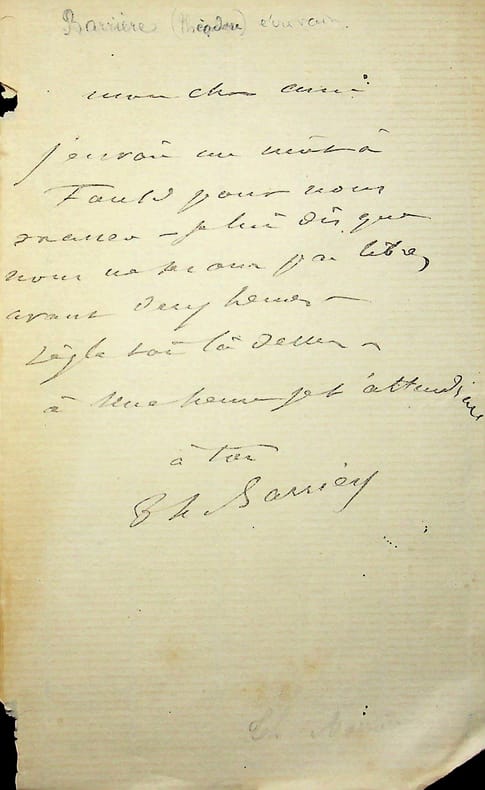 Théodore Barrière (1821-1877), écrivain, dramaturge. L.A.S., sd, 1p in-8. Il donne rendez-vous à son correspondant à 1h et lui demande de dire à « Faul. » qu'ils ne sont pas libres avant 2h. Peut-être est-ce Paul Faulquemont ? [415]