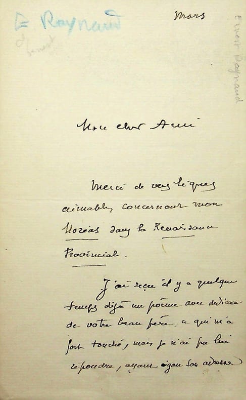 Ernest Reynaud (1864-1936), poète, écrivain. L.A.S., sd [mars 1929], 2p in-8. Il remercie son correspondant pour ses lignes sur son Moréas dans la Renaissance provinciale. Il lui demande de remercier son beau-père dont il a reçu des vers mais n'a pas l'adresse. Il est malade. [415]