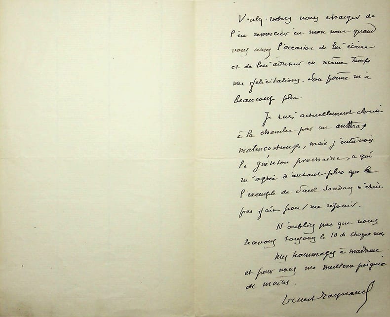 Lettre autographe signée de Félix Fénéon adressée à Gabriel Mourey, 18 lignes à l'encre noire, traces de pliure inhérentes à la mise sous pli de la lettre. Témoin et acteur privilégié de son époque, le critique d'art et collectionneur Félix Fénéon aide l'auteur Gabriel Mourey dans sa quête pourretrouver la correspondance de Paul Adam avec Maurice Barrès : "Le romancier et occultiste Paul Adam fut, comme vous savez, très lié à Maurice Barrès. (Candidats boulangistes dans deux circonscriptions lorraines contiguës, il firent fraternellement une campagne électorale et journalistique à laquelle leur amitié ne survécut guère.)Comment retrouver tous les papiers de Paul Adam, mort il y a une vingtaine d'années ? Mme Paul Adam vit-elle encore. - je n'en sais rien. Mais il est probable que vive une de ses soeurs, veuve depuis quelques trois ans de ce L. Cappielloauteur de tant d'affiches, - peintre elle aussi (et, de plus, fort sourde). Leur demeure était 8 rue Lechatelier, XVIIe. Par Mme L. Cappiello vous retrouverez peut-être des papiers barrésiens laissés par Paul Adam. Pour le cas où vous chercheriez dans cette direction, je note que que j'ai été en excellents termes avec toute la famille et que vous pouvez donc user de mon nom à votre gré." Personnalité majeure de l'Avant-garde, Fénéon avait le talent de débusquer les plus grands artistes. Cet étrange dandy volontairement discret, fit le vude servir quasi religieusement tout ce qui dans l'art forme une nouvelle sensibilité.Défenseur des néo-impressionnistes Seurat et Signac, ami de Mallarmé et de Camille Pissaro, de Paul Adam, Gustave Kahn, anarchiste puis communiste, directeur d'une douzaine de petites revues, il publia des uvres neuves telles les Illuminationsde Rimbaud, lePaludesd'André Gide,Dédalusde James Joyce. Prolifique journaliste, il écrivit partout et ne signa pas ses articles ou emprunta même des pseudonymes extravagants comme Gil de Bache, Porphyre Kalouguine, voire Thérèse ou Louise. Rare lettre de Félix Fénéon sur ses contemporains. Nous y joignions une lettre autographe signée de Fanny Fénéon, femme de Félix Fénéon, datée du 30 décembre 1941 alors que son mari était malade et alité, 10 lignes à l'encre noire, traces de pliure inhérentes à la mise sous pli de la lettre. "Mon mari gravement malade est dans l'impossibilité de recevoir quelqu'un. Si la difficultéque vous désirez lui remettre peut se résoudre par lettre, veuillez lui dire ce dont il s'agit. Une réponse immédiate vous montrera que malgré ses 80 ans, il est tout à votre disposition. [...]" - Photographies et détails sur www.Edition-Originale.com -