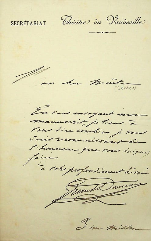 Ernest Grenet-Dancourt (1854-1913), poète, écrivain, chansonnier. L.A.S., sd, 1p in-8. A l'écrivain Victorien Sardou (1831-1908). Il est reconnaissant de l'honneur que lui fait Sardou de lire son manuscrit. [415]