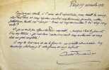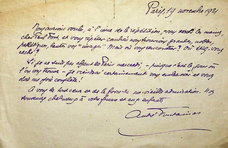 André Fontainas (1865-1948), poète, écrivain belge. L.A.S., Paris, 19 novembre 1921, 1p in-8 oblong. Au poète Paul Fort (1872-1960). Jolie lettre après une répétition lors de laquelle il n'a pas pu croiser Fort, « où étiez-vous caché ? ». Il passera le voir. En 1921, Fort publie une pièce de théâtre, son Louis XI. [415]