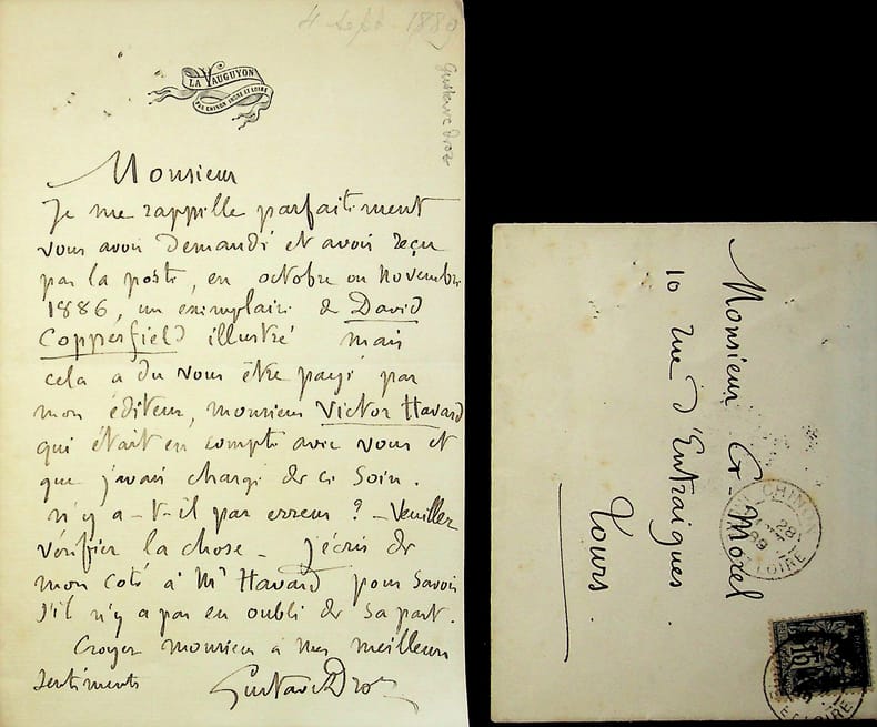 Gustave Droz (1832-1895), peintre, romancier. L.A.S.+enveloppe, 4 septembre 1889, 1p in-8. A G Morel. A propos d'un livre de Dickens, David Copperfield, qu'il lui avait demandé en 1886 et pour lequel Morel semble lui demander la somme. L'éditeur de Droz, Victor Havard, aurait dû s'en charger. [415]