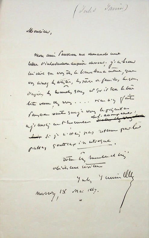 Jules Janin (1804-1874), écrivain, membre de l'Académie française. L.A.S., mercredi 18 mai 1847, 1p in-8. Il recommande le compositeur Auguste Panseron (1795-1859) à son correspondant. Il ne peut l'accompagner s'il n'était retenu par des « pattes goutteuses in utroque ». [415]
