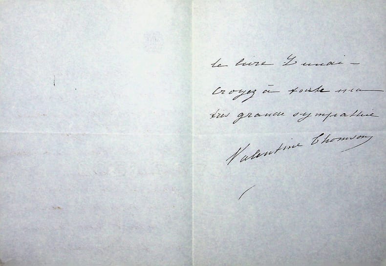 Valentine Thomson (1881-1944), écrivain, éditrice, journaliste. L.A.S., 1p 1/2 in-8. Probablement au poète Paul Fort (1872-1960). Elle lui envoie un livre à signer et le fera récupérer. Peu commun. [415]