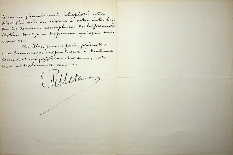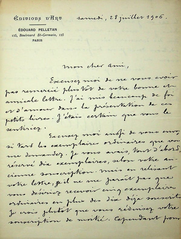 Edouard Pelletan (1854-1912), imprimeur, éditeur. L.A.S., 28 juillet 1906, 1p 1/2 in-4. A Félix Leseur (1861-1950), médecin devenu moine après la mort de son épouse Elisabeth (1866-1914), une mystique. Il répond tardivement et lui demande des précisions sur le nombre d'exemplaires qu'il a souscrit. Comme il avait souscrit 10 exemplaires du précédent ouvrage, il a crû que les 5 exemplaires était en plus mais il se demande si ce n'est pas 5 au lieu de 10. Le livre en question est vraisemblablement Vers les temps meilleurs, d'Anatole France. [416]