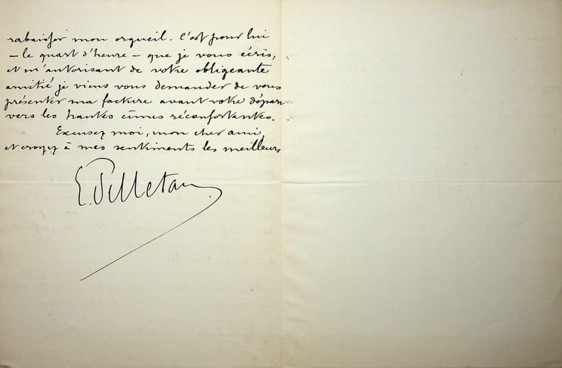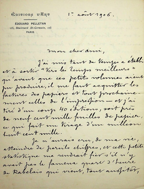 Edouard Pelletan (1854-1912), imprimeur, éditeur. L.A.S., 1er août 1906, 1p 1/2 in-4. A Félix Leseur (1861-1950), médecin devenu moine après la mort de son épouse Elisabeth (1866-1914), une mystique. Le tirage de Vers les temps meilleurs, d'Anatole France, ayant été tellement important, « j'ai tiré d'un coup 40 éditions, soit près de neuf cent mille feuilles de papier, ce qui fait un tirage d'un million huit cent mille », cela cause donc d'importantes dépenses. Il souhaite lui présenter sa facture avant son départ. [416]