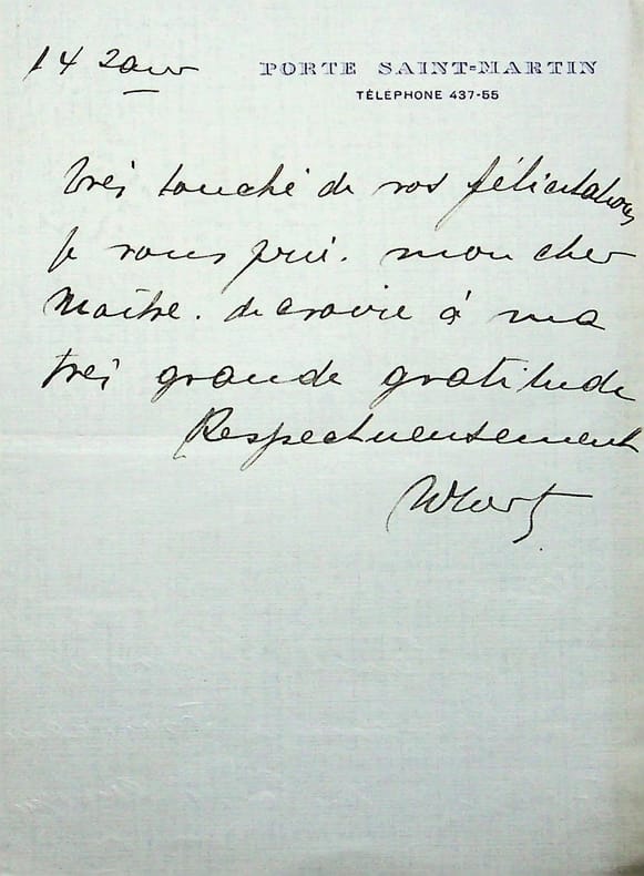 Henri Hertz (1875-1966), écrivain, directeur de théâtre. L.A.S., 14 janvier 1913, 1p in-12. A l'écrivain Paul Hervieu (1857-1915). Remerciements pour des félicitations. [416]