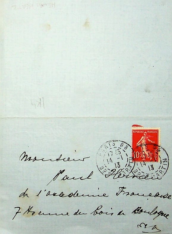 Marcel Prévost (1862-1941), écrivain, membre de l'Académie française. L.A.S., ?, 1p in-12. A l'écrivain Paul Hervieu (1857-1915) : « . De toute façon, je voulais vous écrire pour vous remercier de votre affectueuse entremise. Sans vous l'avoir exprimé, je tenais beaucoup à ce que ma lettre passât par vos mains. J'ai une lettre de Loti s'engageant à voter pour moi contre tout le monde, sauf Ségur ». Le cachet donne l'impression d'être de 1908 mais il s'agit assurément de Pierre de Ségur (1853-1916) qui sera élu le 14 février 1907. [406]