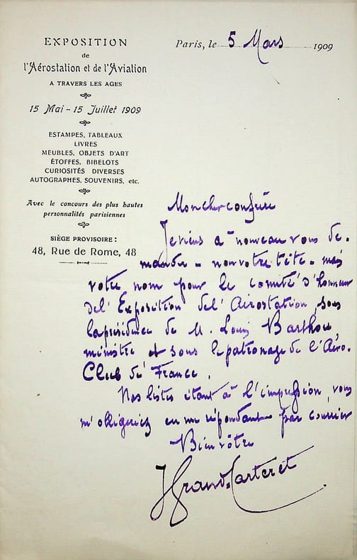John Grand-Carteret (1850-1927), journaliste, historien de la mode. L.A.S., 5 mars 1909, 1p in-8. Il souhaite mettre le nom de son correspondant dans le Comité d'honneur de l'exposition de l'aérostation. [416]
