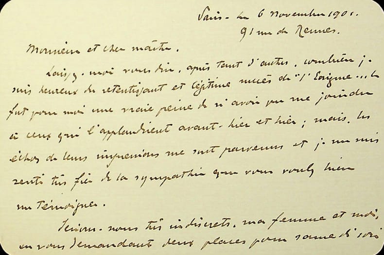 MIRBEAU (Octave). LETTRE AUTOGRAPHE SIGNÉE [À PAUL HERVIEU]. 1 page sur un bifeuillet de papier bleuté à en-tête imprimé « 3 boulevard Delessert », 18 × 13,5 cm. Remarquable lettre écrite en pleine Affaire Dreyfus. « [Paris, 21 février 1898] Cher ami, Vous n’avez pas à être touché de ces mots stupides sur vous. Hélas, depuis cette affaire, je ne puis plus rien faire ; je ne pourrais écrire que là-dessus, et je n’en ai pas le moyen. Aujourd’hui, à la sortie, nous avons été fortement hués et poursuivis. C’était admirable ! Mercredi je serai encore au procès. Pour le dernier jour, je ne puis abandonner cet admirable Zola. Ah ! J’aurais voulu que vous fussiez là, vendredi et samedi ! Ç’a été une chose que vous ne pouvez concevoir. Et vos yeux de voyant eussent vu le crime ! Le crime de Pellieux et de Boisdeffre ! Aussi visiblement que vous me voyez quand je suis devant vous. Ce sont de bien grands bandits. Et cet Esterhazy ! Ah ! Lui du moins, c’est un gredin magnifique ! Je vous embrasse bien tendrement. Octave Mirbeau » Cette lettre est restée inédite jusqu’en 2017, lors de la parution d’un article de Pierre Michel : « Lettres inédites d’Octave Mirbeau à Paul Hervieu », dans les « Cahiers Octave Mirbeau », n° 24, 2017, pages 163-207. Cette lettre y figure sous le numéro 51. C’est cet article qui nous permet d’apporter les précisions suivantes : — « [c]es mots stupides sur vous » : allusion à un article paru dans le Journal du 20 février. — Zola se trouve en procès depuis le 7 février et Mirbeau, qui l’accompagne chaque jour, lui tient parfois lieu de garde du corps. — « [j]e n’en ai pas le moyen » : « Les colonnes du Journal lui seraient fermées s’il y développait des analyses dreyfusardes » (Pierre Michel, article cité). — « à la sortie » : à la sortie du tribunal, où le procès de Zola s’est tenu du 7 au 23 février 1898. — « Mercredi » désigne le 23 février — il s’agit bien du dernier jour du procès de Zola.