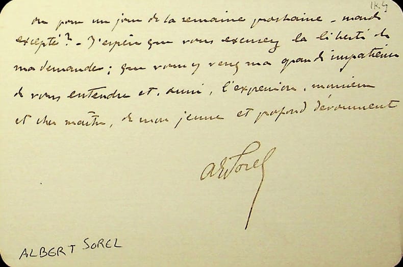 Albert Sorel (1842-1906), historien, membre de l'Académie française. L.A.S., Paris, 6 novembre 1901, 2p in-12. A l'écrivain Paul Hervieu (1857-1915). Il se réjouit du succès de L'Enigme, la pièce de théâtre d'Hervieu créée la veille. [416]
