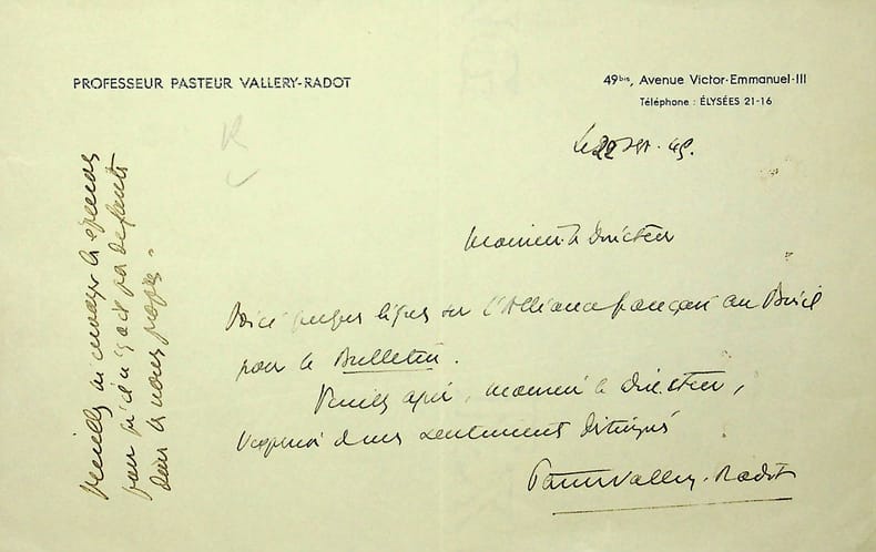 Louis Pasteur Vallery-Radot (1886-1970), médecin, homme politique. L.A.S., 22 [septembre?] 1945, 1p in-8 oblong. Il envoie des lignes pour un bulletin et demande des épreuves. [416]