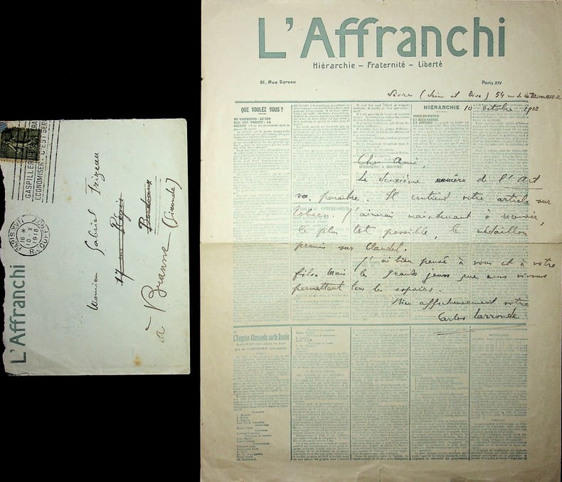Carlos Larronde (1888-1940), poète, écrivain, maître verrier. L.A.S.+enveloppe, 10 octobre 1918, 1p in-8. Au viticulteur et collectionneur Gabriel Frizeau (1870-1938). Il lui annonce le 2e numero de l'Art avec l'article de Frizeau. Il réclame le médaillon promis sur Claudel. La lettre est écrite sur un journal L'Affranchi. [416]