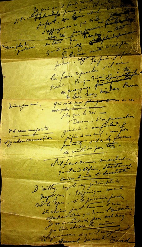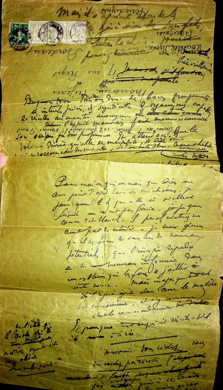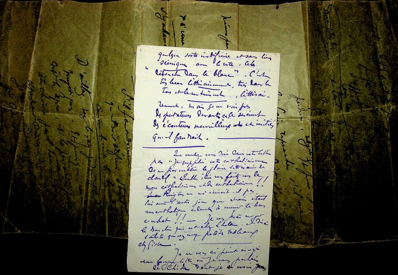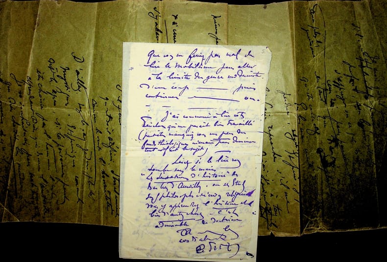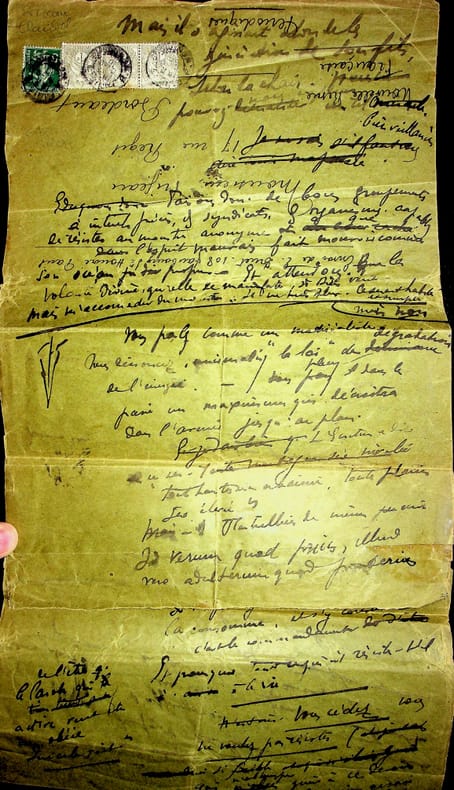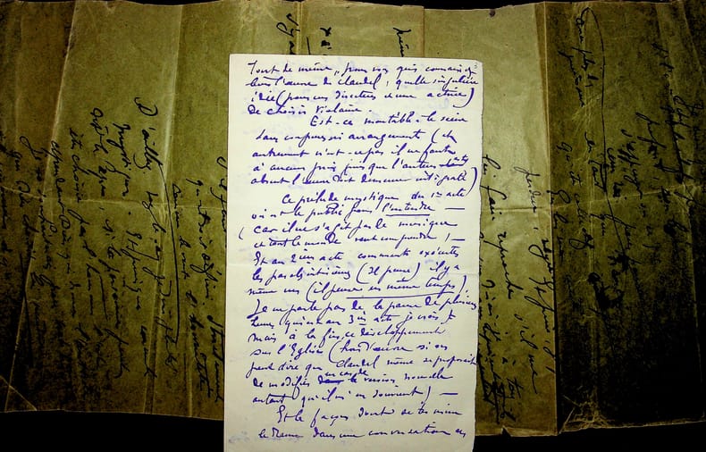 Gabriel Frizeau (1870-1938), viticulteur, collectionneur. Manuscrit autographe signé, sd [après 1910], 5p in-8/in-folio. Important brouillon signé, difficile à déchiffrer, parlant à plusieurs reprises de Claudel, du personnage Violaine (l'annonce faite à Marie), Barbey d'Aurevilly, du catholicisme, de mystique, etc. Le grand feuillet, formé de plusieurs morceaux d'enveloppe, n'est pas numéroté. Les trois derniers feuillets sont numérotés 3 à 5, avec une signature à la fin « G Friz- ». Rare document. [416]