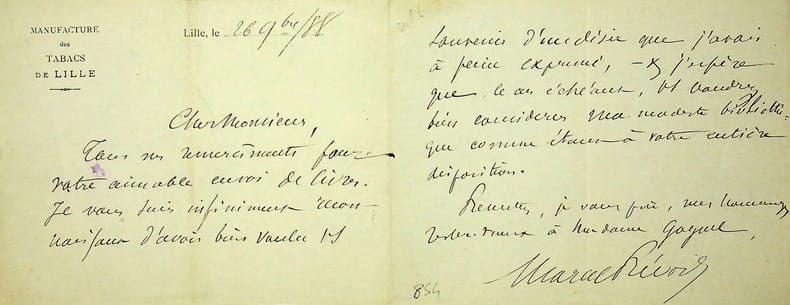 Marcel Prévost (1862-1941), écrivain, membre de l'Académie française. L.A.S., 26 septembre 1888, 2p in-12. Entête de la manufacture de tabacs de Lille. Il remercie M. Goguel de l'envoi de livres. [417]