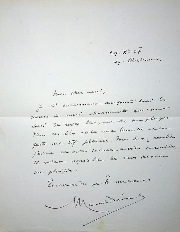 Marcel Prévost (1862-1941), écrivain, membre de l'Académie française. L.A.S., 29 décembre 1927, 1p in-4. A l'écrivain Henri Béraud (1885-1958). « mon cher ami, Je lis seulement aujourd'hui les noms des amis charmants qui ont serti de roses l'argent de ma plaque. Vous en êtes : cela me touche et me fait un vif plaisir. Vous savez combien j'aime et votre talent & votre caractère ; il m'est agréable de vous devoir un plaisir. Tout à vous & tous mes voeux. Marcel Prévost ». [417]
