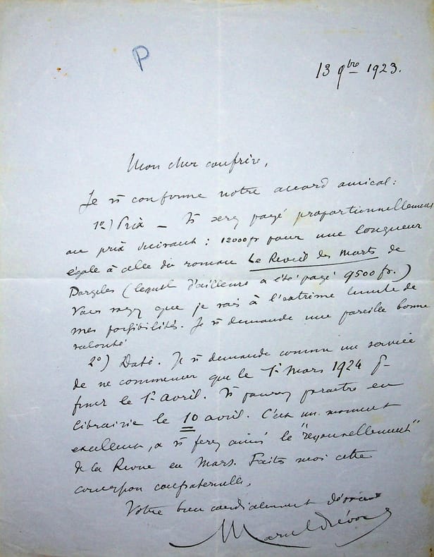 Marcel Prévost (1862-1941), écrivain, membre de l'Académie française. L.A.S., 13 novembre 1923, 1p in-4. A l'écrivain Henri Béraud (1885-1958) sur son prochain roman, Lazare : « mon cher confrère, je vous confirme notre accord amical. » pour la publication d'un ouvrage, promettant 12000 francs quand il a payé 9500 pour Le Réveil des morts de Roland Dorgelès. Il ne peut faire plus. Il souhaiterait faire paraître le livre en 10 avril 1924. Cette lettre montre d'ailleurs que Prévost travaillait avec Albin Michel. Très belle lettre. [417]