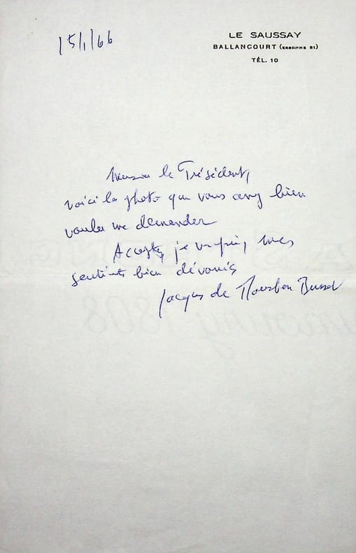 Jacques de Bourbon Busset (1912-2001), écrivain, membre de l'Académie française. L.A.S., 15 janvier 1966, 1p in-8. Il envoie la photo demandée par son correspondant. [417]