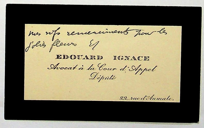 Edouard Ignace (1862-1924), homme politique, député. C.A.S. « E.I. », sd, 2 lignes. « Nos vifs remerciements pour les fleurs. E.I. ». [416]