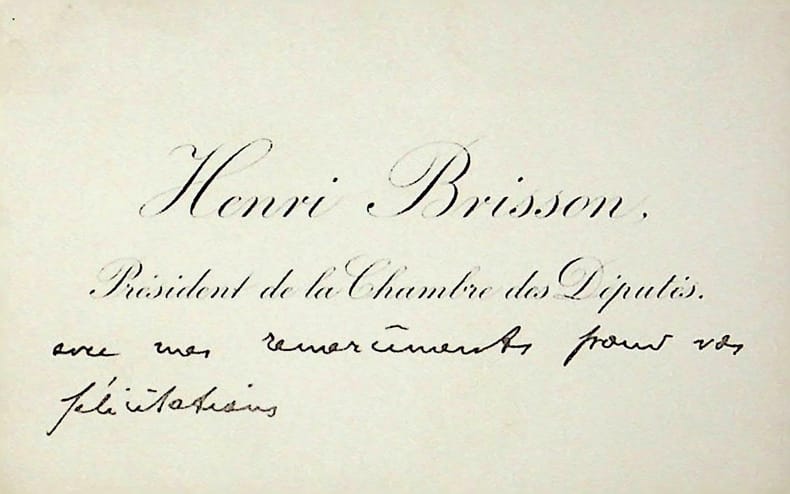 Henri Brisson (1835-1912), avocat, journaliste, homme politique. C.A., sd, 1 ligne. « Avec mes remerciements pour ses félicitations ». [416]