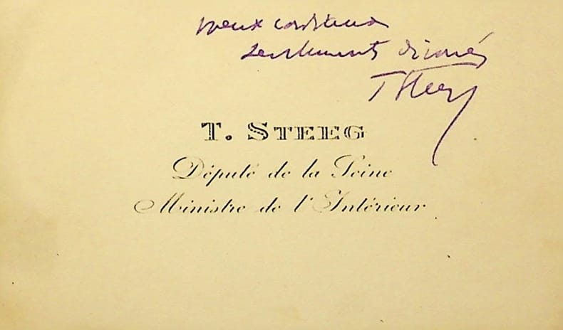 Théodore Steeg (1868-1950), homme politique, administrateur colonial. C.A.S., sd, 2 lignes. « Voeux cordiaux. Sentiments dévoués. T Steeg ». [416]
