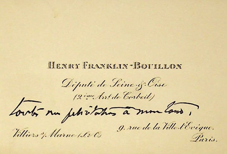 Henri Franklin-Bouillon (1870-1937), homme politique, député. C.A., sd, 1 ligne. « Toutes nos félicitations à Montand (?) ». [416]