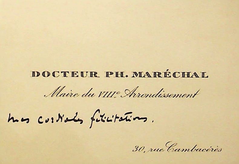 Philippe Maréchal (1859-1926), médecin, maire d'arrondissement à Paris, membre de la SPA. C.A., sd, 1 ligne. « Mes cordiales félicitations ». [417]