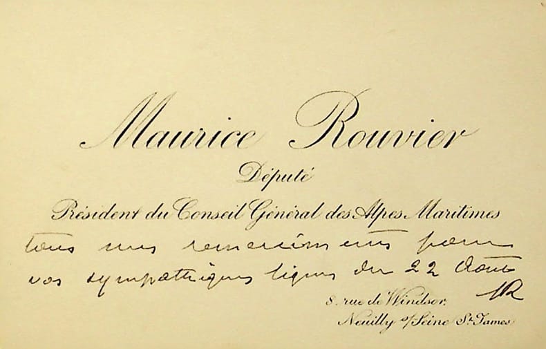 Maurice Rouvier (1842-1911), banquier, journaliste, homme politique, président du Conseil, ministre. C.A.S., sd, 2 lignes. « Tous mes remerciements pour vos sympathiques lignes du 22 août. MR ». [417]