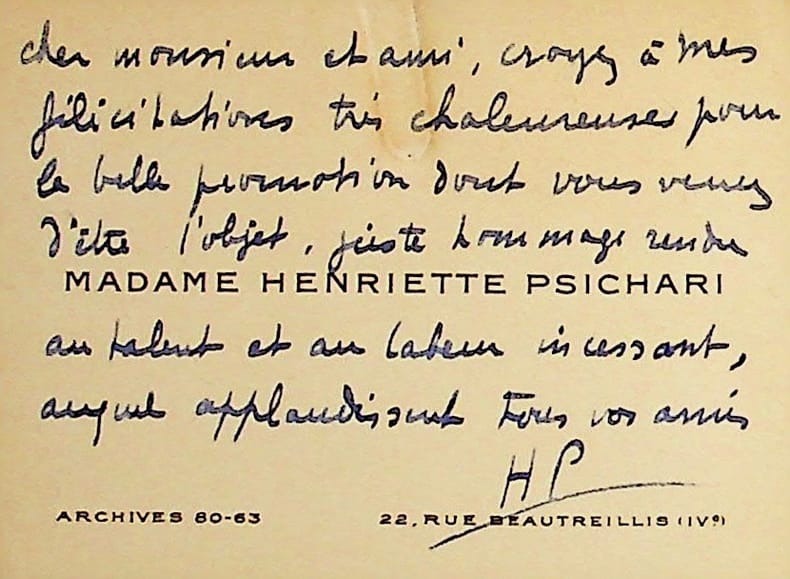 Henriette Psichari (1884-1972), femme de lettres, éditrice. C.A.S., sd, 6 lignes. « Cher monsieur et ami, croyez à mes félicitations très chaleureuses pour la belle promotion dont vous venez d'être l'objet, juste hommage rendu au talent et au labeur incessant, auquel applaudissent tous vos amis. HP ». [417]