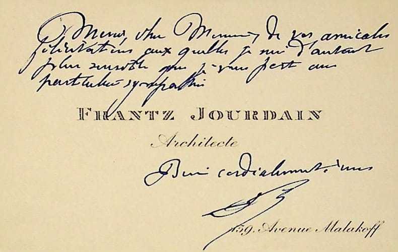 Frantz Jourdain (1847-1935), architecte, écrivain, belge naturalisé français. C.A.S., sd, 4 lignes. « Merci, cher monsieur, de vos amicales félicitations auxquelles je suis d'autant plus sensible que je vous porte une particulière sympathie. Bien cordialement à vous. FJ ». [418]